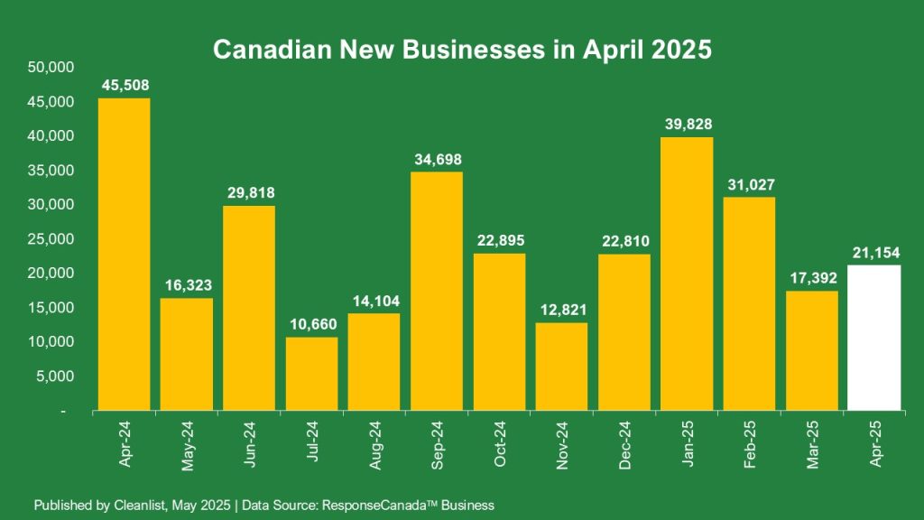 After two straight months of steep declines, new business creation in Canada bounced back in April. A total of 21,154 new businesses were registered—up 22% from March’s count of 17,392.