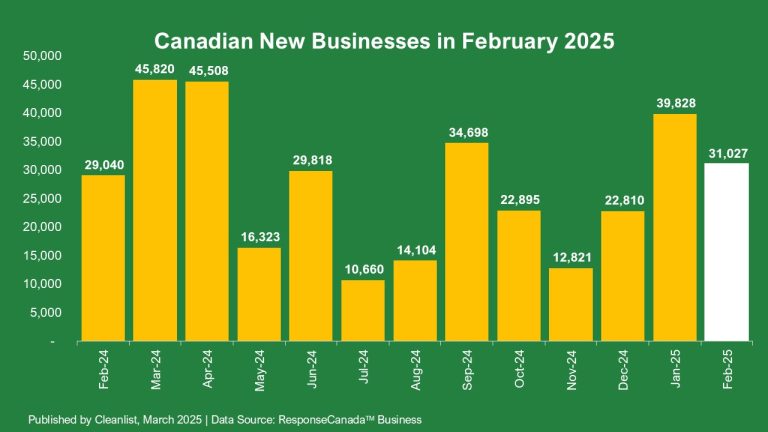 Cleanlist reported 31,027 new business openings in Canada in February 2025, a slight 6.8% increase year over year from February 2024 to February 2025 and a significant 22.1% decline month over month from January 2025 to February 2025.