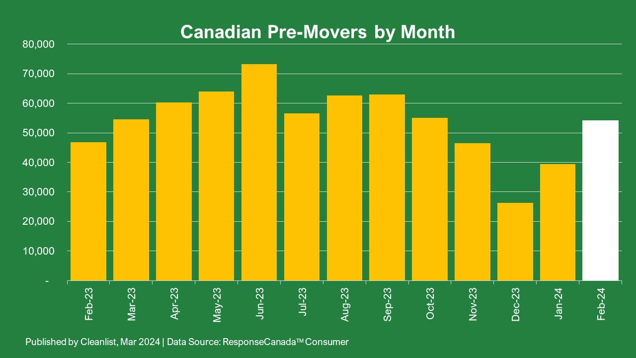 In February, Cleanlist identified 54,244 pre-movers in Canada. We reported a modest 15.7% increase in pre-movers from February 2023 to February 2024 and a significant increase of 37.9% month-to-month.