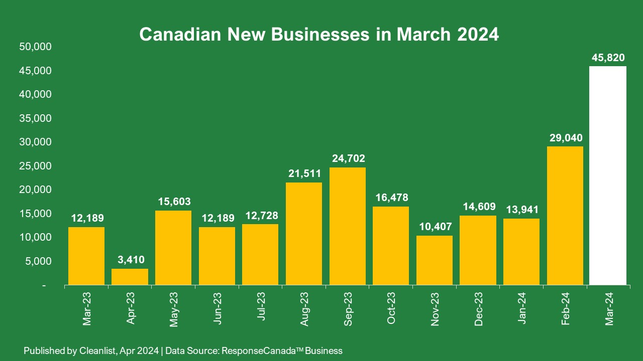 Cleanlist reports that 45,820 new businesses opened in March 2024 in Canada. This number is the highest it’s been in over a year. It is memorable compared to 29,040 new businesses opening in February 2024, resulting in a 57.8% increase in new businesses from month to month. Additionally, when we compare the number of new businesses that opened in March 2023 (12,189) vs March 2024, we noticed a monumental 275.9% increase in new businesses since this time last year.