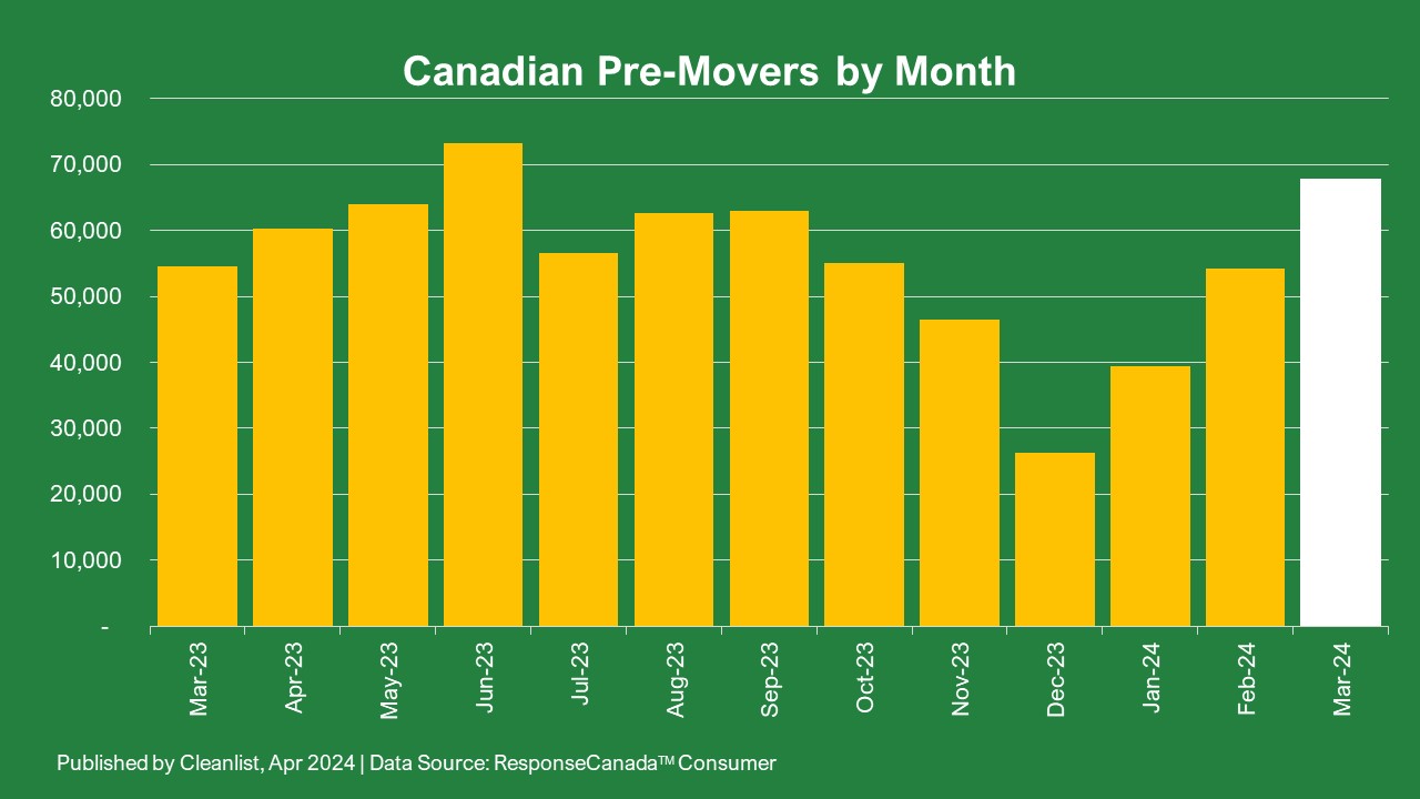 In March, Cleanlist identified 67,886 pre-movers in Canada. We reported a significant 24.5% increase in pre-movers from March 2023 to March 2024 and once again a notable increase month-over-month (25.2%) from February 2024 to March 2024.