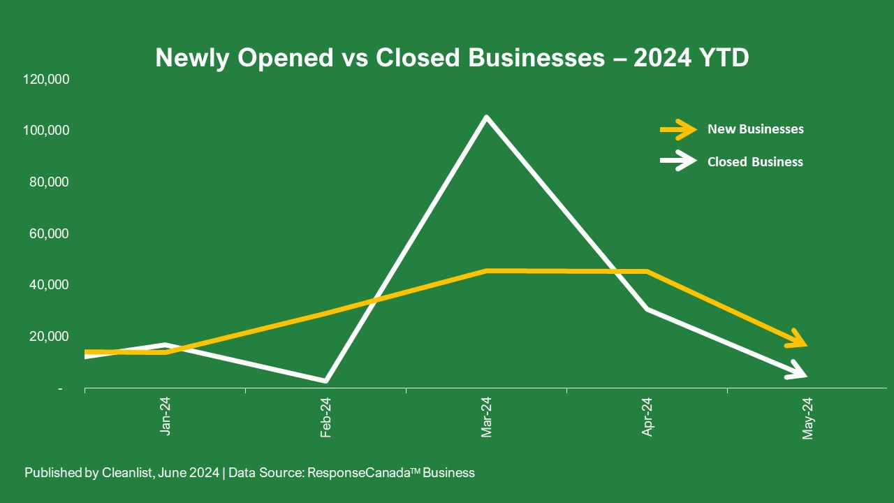 Cleanlist reports that 16,323 new businesses opened in May 2024 in Canada. This number drastically dropped from April 2024, resulting in a 64.1% decrease in new businesses month over month. However, the number of new businesses opened in May 2024 is similar to May 2023 with only a slight increase of 4.6%.