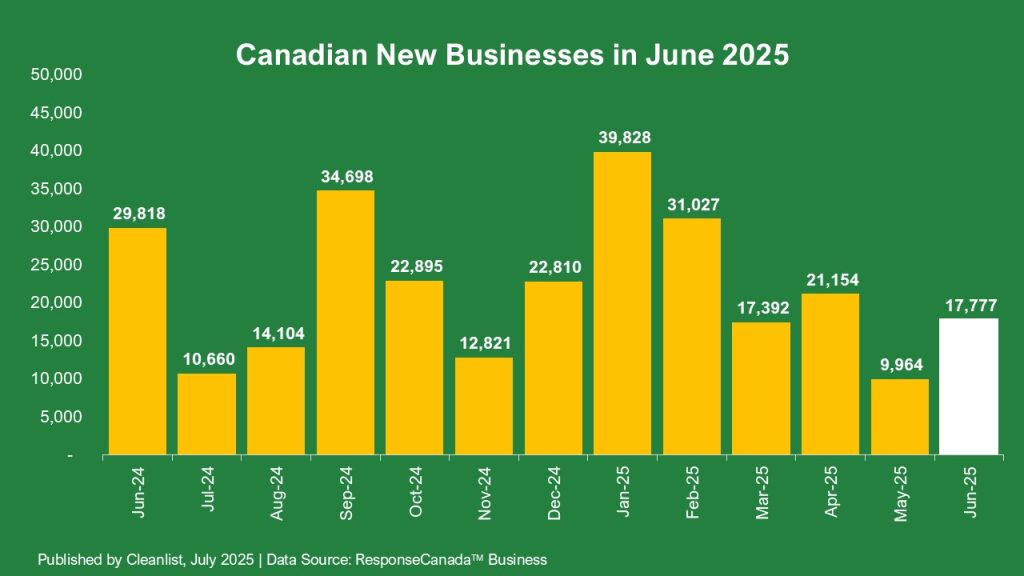 Canadian business formation is struggling to regain its footing—and the latest numbers from Cleanlist confirm it. June saw just 17,777 new businesses open, continuing a steep year-over-year decline. That’s 40.4% fewer than the 29,818 recorded in June 2024.