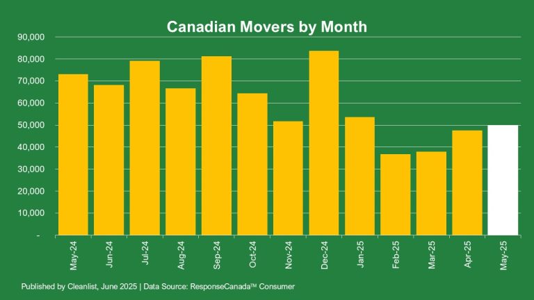 According to Cleanlist’s national mover tracking, 49,828 Canadian households changed address in May 2025—a 5% increase from April (47,631).
