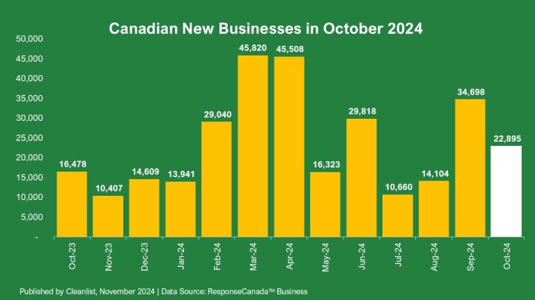 Cleanlist reported that 22,895 new businesses opened in October 2024 in Canada. This number is a significant 34% decrease from the September 2024 high of 34,698 new businesses opened in one month. Furthermore, the number of new businesses opened this past October compared to last October (2023) increased significantly by 38.9%.