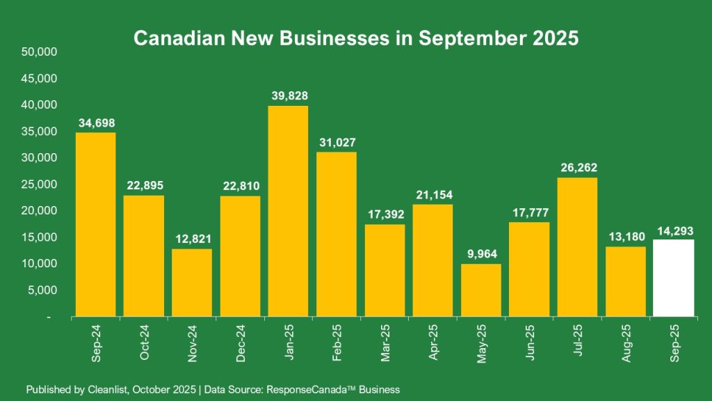 After a steep drop in August, September brought signs of stabilization in Canada’s business landscape. 14,293 new businesses were registered, up 8% from last month but still 59% below September 2024. Closures moderated sharply to 33,544, down 45% from August’s surge but 43% higher than last year. The result was a net decline of just over 19,000 businesses — far smaller than August’s contraction.