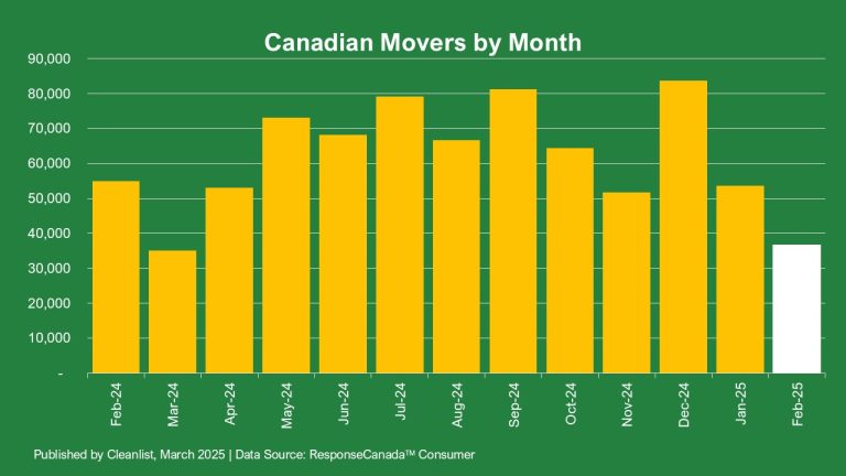 Cleanlist identified 26,774 new movers in Canada in February 2025. This resulted in a significant 33% decrease in new movers from February 2024 to February 2025 and a slightly lower 31.4% decrease month-over-month from January 2025 to February 2025.
